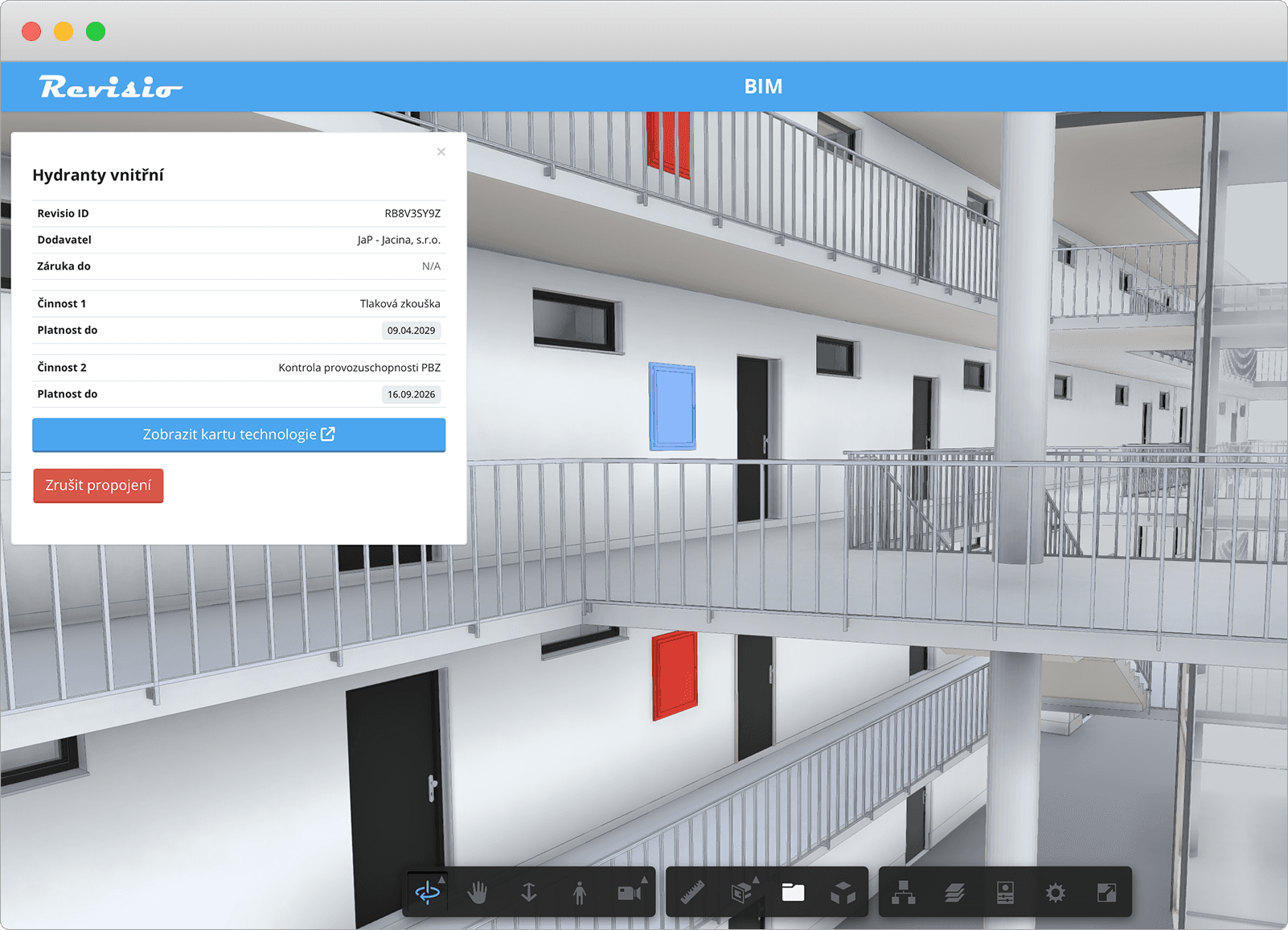 CAFM systém Revisio nabízí unikátní řešení provázání dat mezi BIM modelem a CAFM systémem. Data v BIM modelu i CAFM systému jsou vždy aktuální a synchronizovaná. V BIM modelu lze vždy zobrazovat aktuální data o všech technologiích, stavebních prvcích, nebo třeba měřidlech a IOT čidlech.